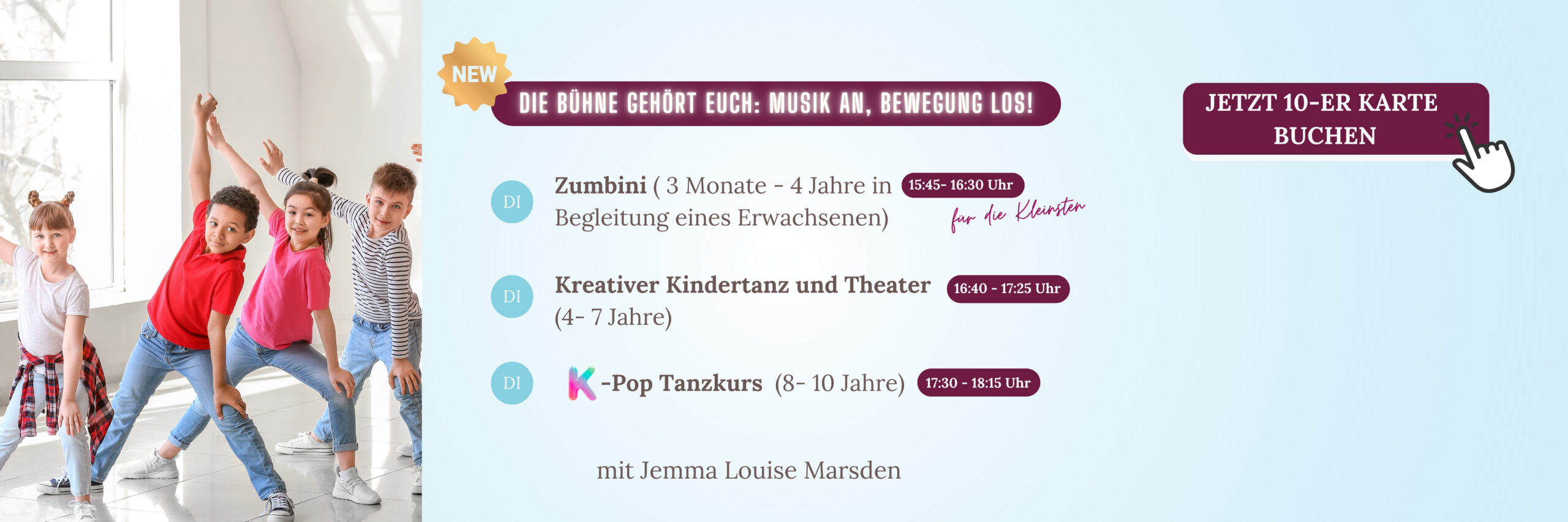 Weitere Tanz- und Bewegungskurse bei unserer Dozentin Jemma sind: Kreativen Kindertanz und Theater-Kurs (4-7 Jahre) und K-Pop Tanzkurs (8-10 Jahre). Beide Kurse finden jeden Dienstag statt.